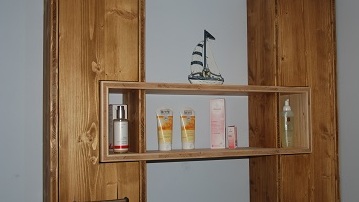 Schrank eingepasst in eine freistehende Wand im Bad.