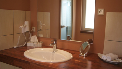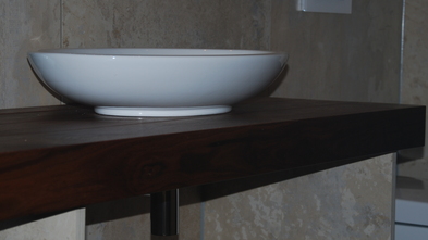 Waschtischplatten im WC gefertigt aus Dielenboden Nussbaum